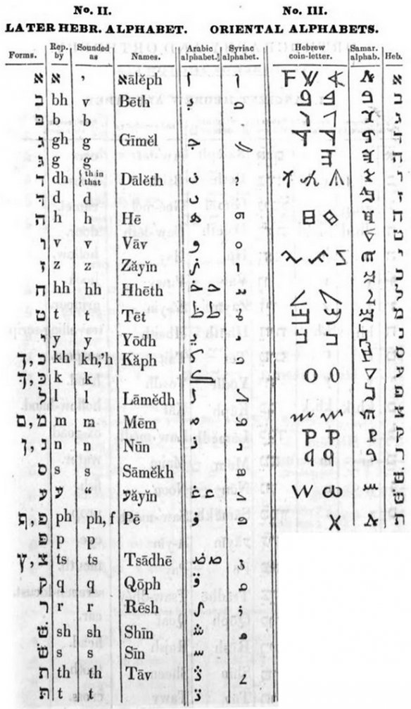 Another Hebrew book theoretically available to Oliver Cowdery when he went east to bring Hebrew books back to Kirtland could be Hyman Hurwitz’s The Elements of the Hebrew Language, first printed in 1832, with a second edition in 1835,33 and also Hurwitz’s The Etymology and Syntax in Continuation of the Elements of the Hebrew Language from 1831.34 Hurwitz is not listed in Matthew Grey’s list, but there is no reason to believe the list from Grey is complete. Though printed in London, there would be adequate time for it to have reached the United States by late 1835 when Oliver was in the market for Hebrew books.Multiple clues point to prior or concurrent Hebrew study as the KEP was prepared. Perhaps the most striking single clue may be the use of an unusual symbol from Moses Stuart’s A Grammar of the Hebrew Language. Consider the beginning of Stuart’s book on p. 10, shown in Figure 1, where the Hebrew alphabet is presented with some other forms of Hebrew letters or other alphabets.[Page 37]