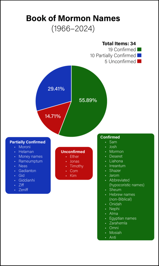 During the first period (1830–1844), seventeen names of the Book of Mormon text were considered implausible or anachronistic, none of which could be confirmed (figure 43). In the next 120 years (1845–1965), the total number of anachronisms increased to twenty-seven. One name was confirmed, two were partially confirmed, and the remaining twenty-four lacked confirmation (figure 44). During the last period (1966–2024), while the total number of items rose to thirty-four, nineteen items found confirmation, ten partial confirmation, and five lacked confirmation (figure 45).