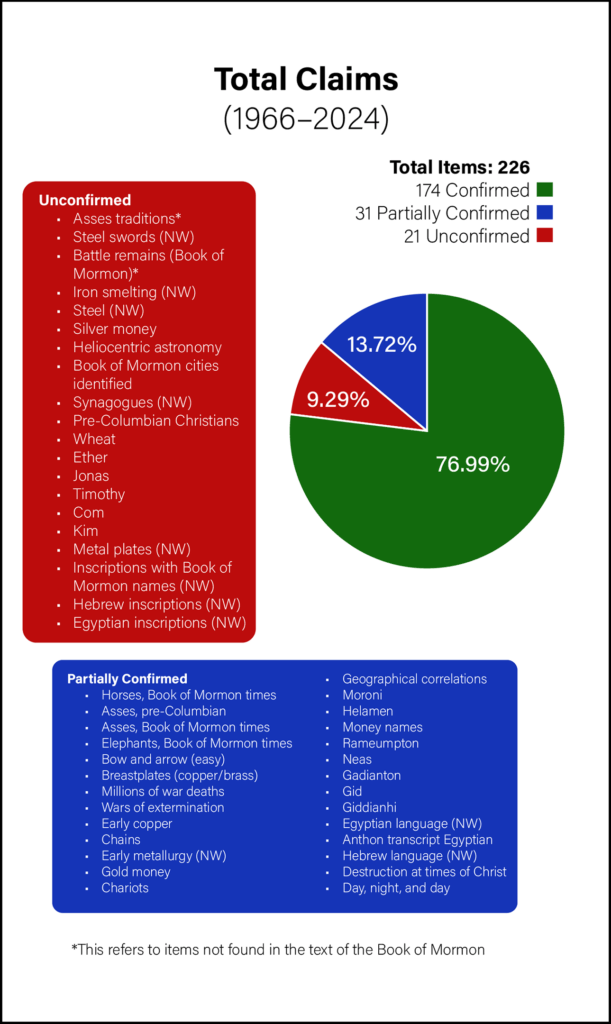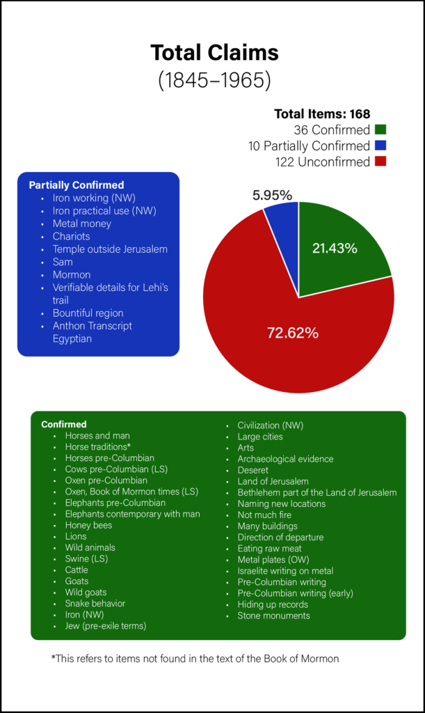 [Page 246]Notably, while the number of alleged anachronisms increased during each of the three periods, so did the number of confirmations. Not only did they increase, but they increased exponentially. Whereas 90.2% of the items remained unconfirmed in 1844, today that figure has dropped to a meager 9.29%. Thus, the key finding of this study is that, over time, allegedly problematic features of the Book of Mormon text have strongly trended towards confirmation or partial confirmation, especially in the past fifty-eight years.