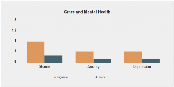 As shown in Figure 1, there is a stark difference in levels of shame, anxiety and depression between Latter day Saint Church members who view God through a construct of works being the most important (called “Legalism”) and those who view grace as the most important. As one can [Page 91]see, those with a Legalism outlook had noticeably higher scores on shame, anxiety, and depression than did the members with a grace outlook.