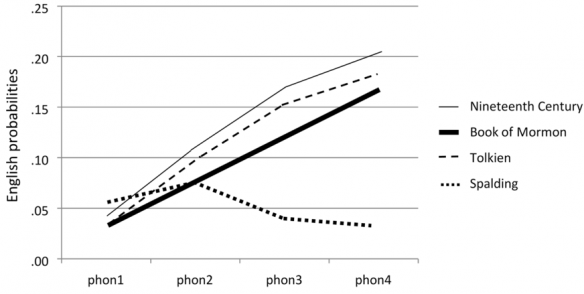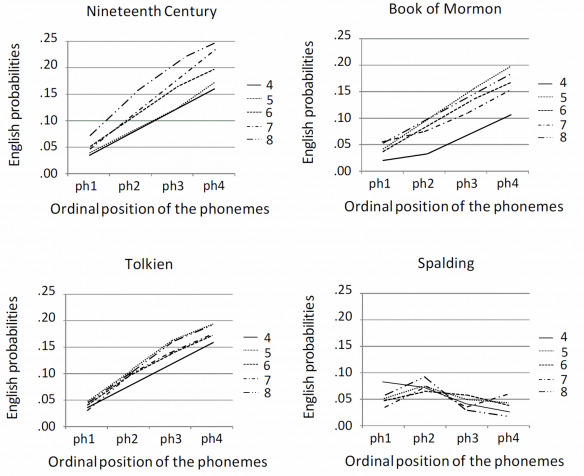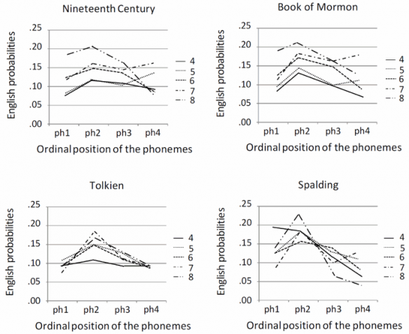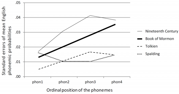 Since the Spalding manuscript had no names with fewer than four phonemes or more than eight, we restricted ourselves to this range. Results of the 2013 study showed that the tests differentiated clearly between the Spalding names and the natural nineteenth-century names. However, the fictional names crafted by Tolkien were similar to natural naming patterns. Book of Mormon names also differed from the Spalding names and aligned with the phonemic probabilities of the nineteenth- century and Tolkien names. These three name sources showed greater variances in each ordinal position, whereas the Spalding names did not vary greatly (see Figure 1).