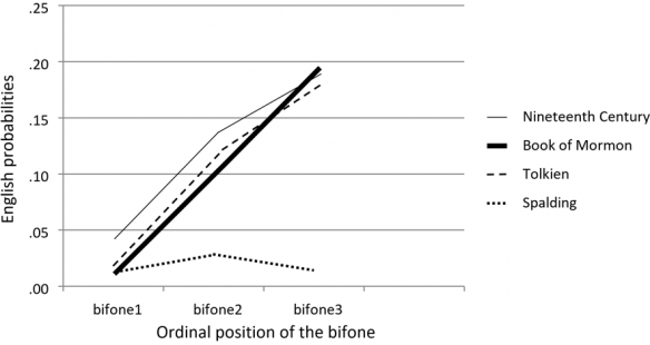 In the test of the first hypothesis, Book of Mormon and Tolkien names aligned with nineteenth-century names. In the second hypothesis, Book of Mormon names and Spalding names aligned with nineteenth- century names. In the third and fourth hypotheses, Book of Mormon names aligned with nineteenth-century names and both differed significantly from Spalding and Tolkien names. In these tests, the variance of phonotactic probabilities across different name lengths was greater in the natural naming practices of nineteenth- century names than in Spalding’s and Tolkien’s fictional naming systems. Across all four tests, the Book of Mormon phonotactic probabilities were consistent with natural naming practices. Thus, the pattern that surfaced in names in the Book of Mormon seems to have more in common with the pattern found in authentic names from a century of census recording than it does with those from fictional works. We are not saying that Book of Mormon names are similar to nineteenth-century names. Rather, they both show similar patterns when phonotactic probabilities are the common measure.