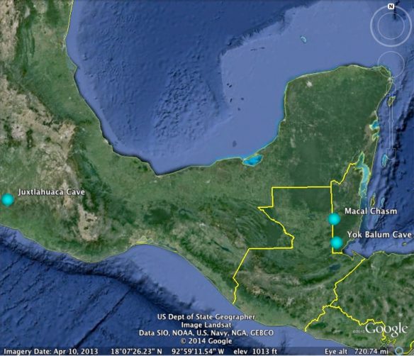 Figure 1. Map of cave locations in Mesoamerica where stalagmites were collected.