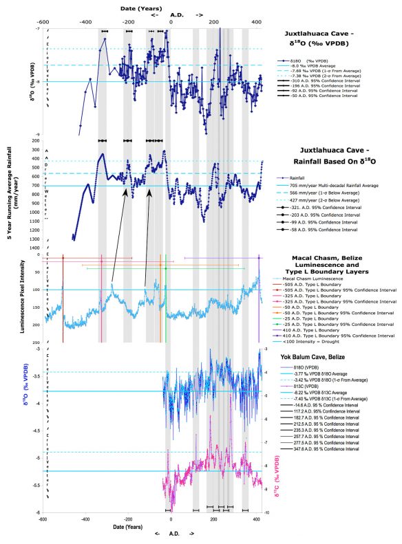 “Because samples could be dated with some degree of precision, there is now, thanks to many researchers, a continuous record of climate changes for the Maya lowlands extending over a period of 3,500 years. This has since been supplemented by research on stalagmites in Belizean caves. Growing slowly yet steadily, cave deposits show, with precision of a few dozen years, a similar pattern of droughts that lasted for decades. One episode struck between AD 200 and 300, another from AD 820 to 870, then two more at AD 1020 to 1100 and AD 1530 to 1580….During much of the Preclassic period, the climate was wet (low concentrations of oxygen-18); at this time, the now-swampy bajos were shallow lakes. But prior to the beginning of the Classic (c. AD 250), severe droughts afflicted the Maya region.”