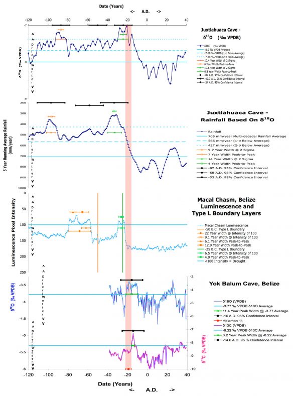 The events around Christ’s death might have left evidence that could be dated. But they may not be related to climate. 3rd Nephi mentions a “tempest”. I found a paper that studied stalagmites in caverns in the Yucatan peninsula that become flooded during large storm events such as hurricanes. When the cavern is flooded, everything is coated with a layer of mud and organic material and leaves a detectable/dateable layer that can be associated with the large storm event. They correlated these layers in a collected stalagmite with known historical hurricanes and found good correlation between the stalagmite record and historically documented storms. They also found pre-historical layers which included the time of the destruction after the death of Christ, but there were none that correlated to within the dating error with the expected time frame around ~33 A.D. So the “tempest” may not have been a hurricane or if it was a hurricane, it did not affect this particular stalagmite.