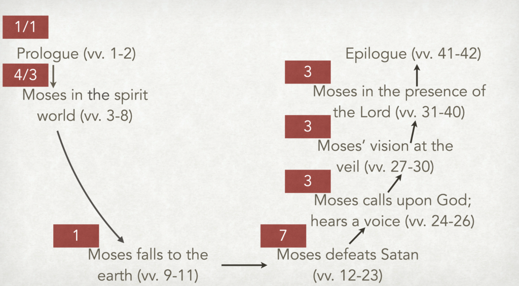 Overview of resemblances in narrative structure. Accounts of heavenly ascent and temple ritual are not uncommonly structured into two main parts: a “down-road” followed by an “up-road.”64 Consistent with this pattern, Moses 1 takes the prophet from a vision of his first home in the spirit world, then downward to the telestial world of the [Page 191]mortal earth, and, finally, upward in a step-by-step return to God. Moses’s experience culminates within the “heavenly temple,” where he is shown a vision of the Creation, the Fall, and the essential role of the Atonement, as described in Moses chapters 2–5. Notably, the grand vision of Enoch in Moses 6–7 contains some of the same elements as Moses 1, with some variation in sequence and emphasis.65
