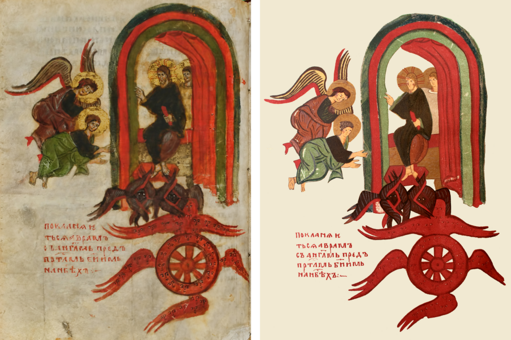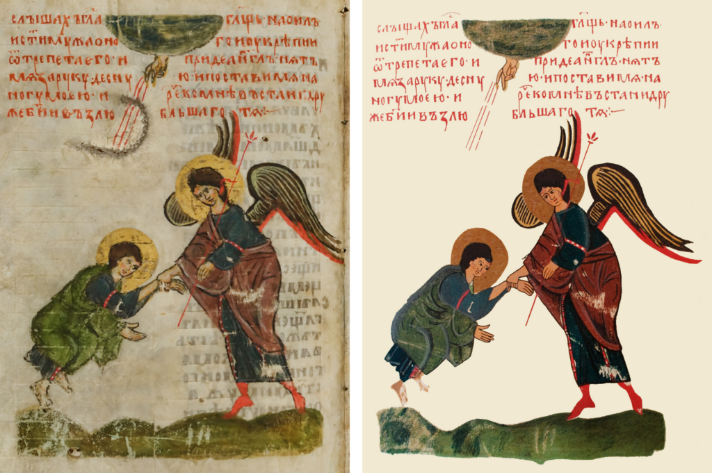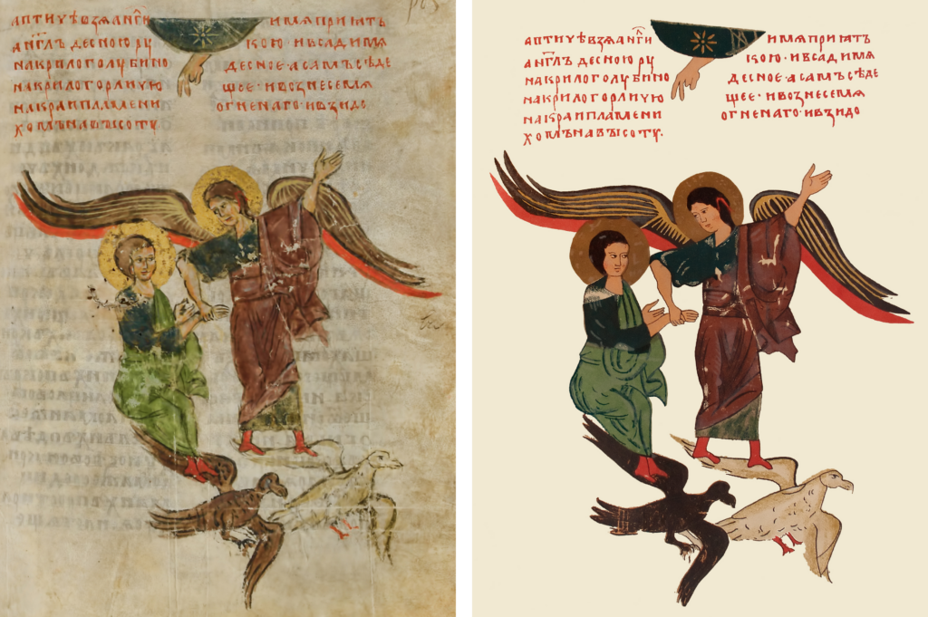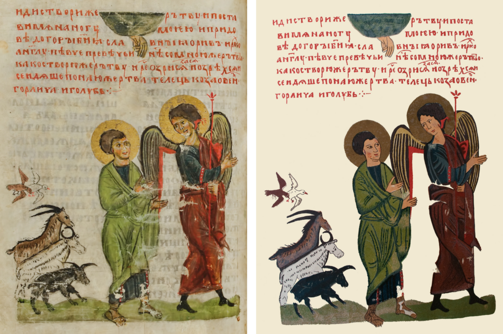 Figure 3. Abraham with Sacrificial Animals. Left: Photo of the Codex Sylvester. Right: Photo of the facsimile version.