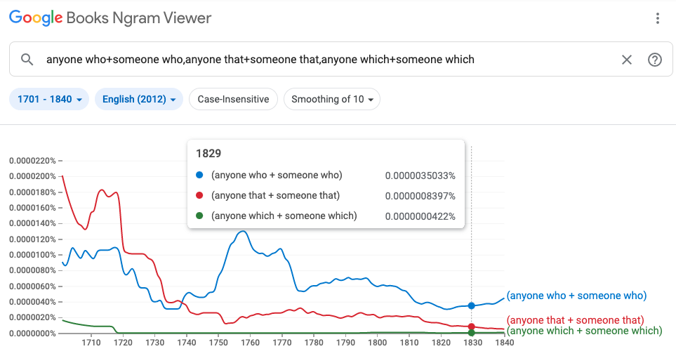 Figure 1 indicates that anyone who and someone who were dominant in the 1820s over anyone that and someone that; and anyone which and someone which are two orders of magnitude below the who variants. In the early 1700s, “anyone/someone that” was still dominant, but by the late 1700s “anyone/someone who” was dominant. Though it would not be unusual to find scattered instances of personal which in Joseph’s day, including in his own early writings (there are two of them), the use of personal which was dwarfed by competing options.