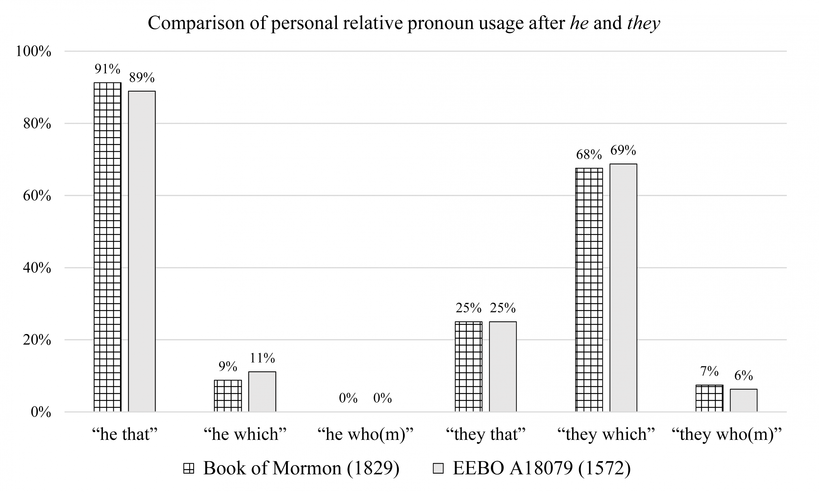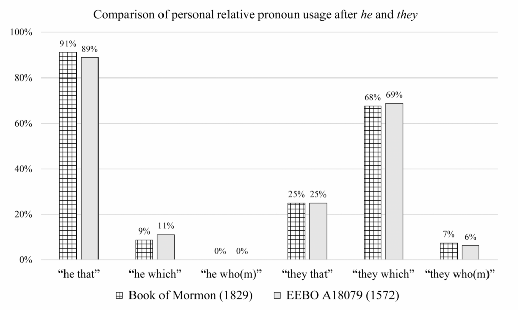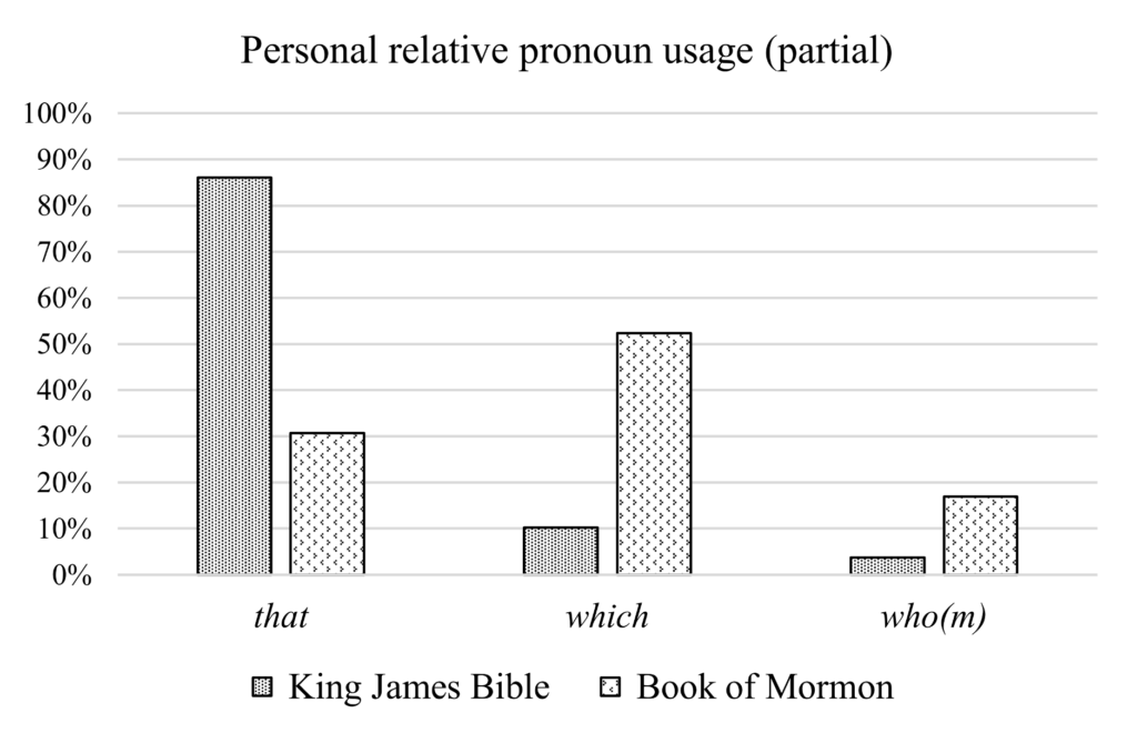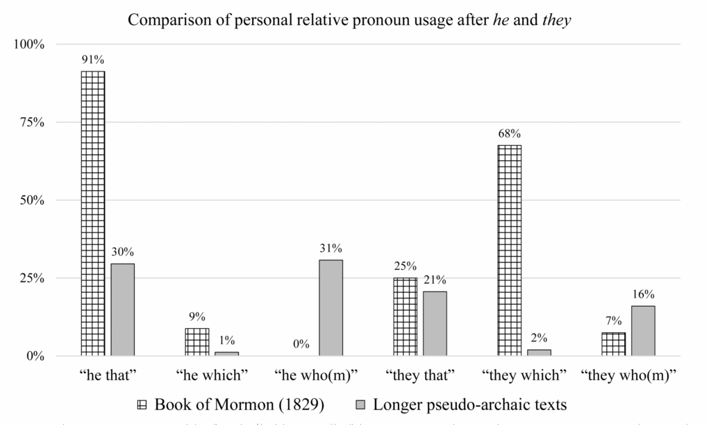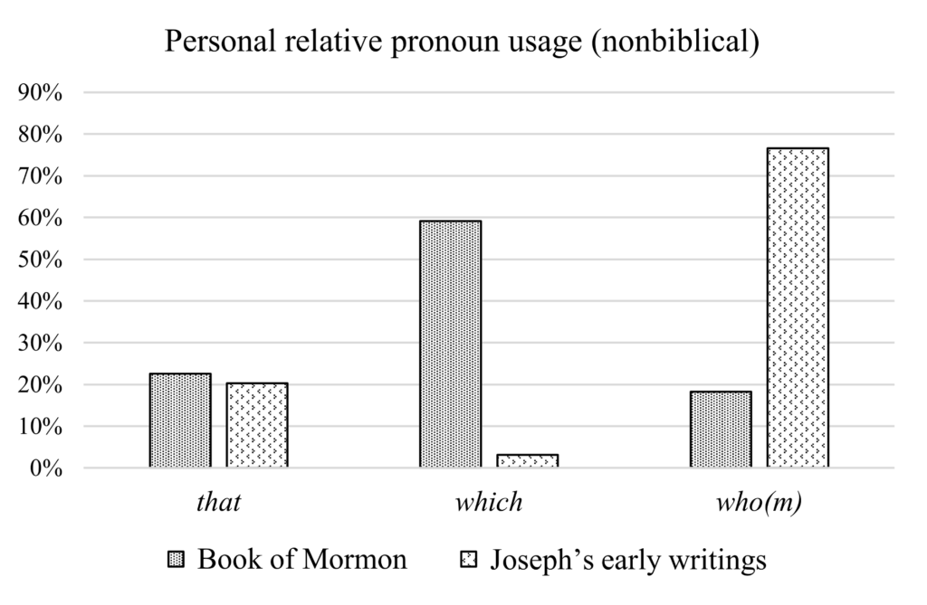 With that in mind, I compared what Joseph Smith produced in this domain with what pseudo-archaic authors produced. An examination of these texts indicates that as far as personal relative pronoun usage is concerned, Joseph Smith was unlikely to have sustained conscious manipulation of usage patterns that varied substantially from modern usage beyond some slight biblical influence. Most pseudo-archaic authors show a modern pattern, heavy in who or whom. A few produced more personal that than was normal for their time, showing that they were able to imitate biblical usage a little more closely, but no one came very close to being biblical in this regard. Most telling is that no pseudo-archaic author produced usage that was heavy in personal which, such as representing more than half the relative personal pronoun usage, as we find in the Book of Mormon. Thus, even if Joseph Smith had been able to closely imitate biblical patterns in this domain, he almost certainly would not have produced the heavy personal which of the Book of Mormon.