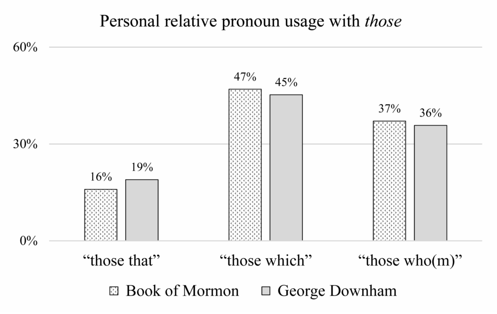 [Page 12]This comparison shows large differences in the case of which and who(m). In the Book of Mormon, which is strongly preferred, with that slightly exceeding who(m). In contrast, Joseph Smith had a strong personal preference for who(m) over that, with which a distant third. Figure 2 graphically shows that Joseph’s native PRP usage pattern was markedly different from that of the Book of Mormon.