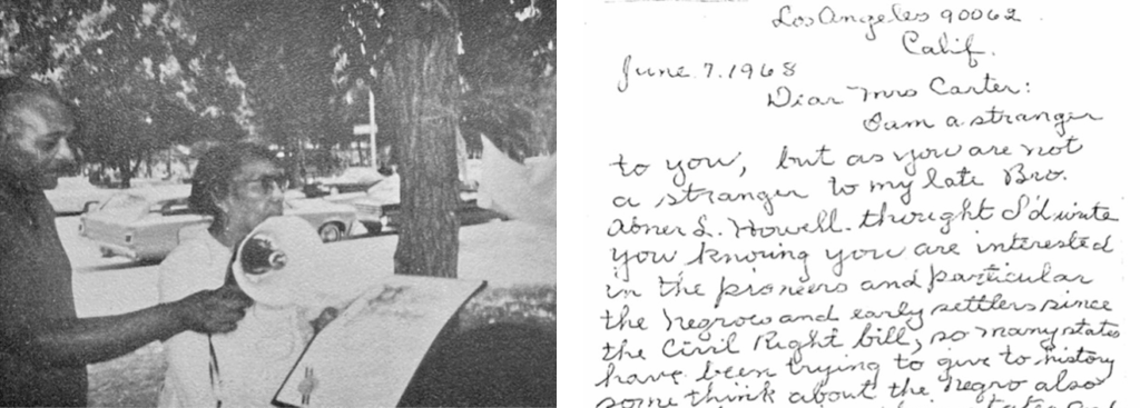 Figure 2. Left: James Later holds a megaphone for Byrdie Howell Langon at a twenty-fifth annual Salt Lake Picnic in Hollywood Park, 27 July 1969. At the event, Byrdie was honored with two citations, one from the Los Angeles Councilman from her home district and another from the Bethel A.M. E. church;5 Right: Excerpt from letter of Byrdie to Kate B. Carter about her family history: “I am a stranger to you, but as you are not a stranger to my late Bro. Abner L. Howell thought I’d write you knowing you are interested in the pioneers and particular the Negroes and early settlers since the Civil Rights bill, so many states have been trying to give to history some thin[g] about the Negro also about the ones in their states.”6