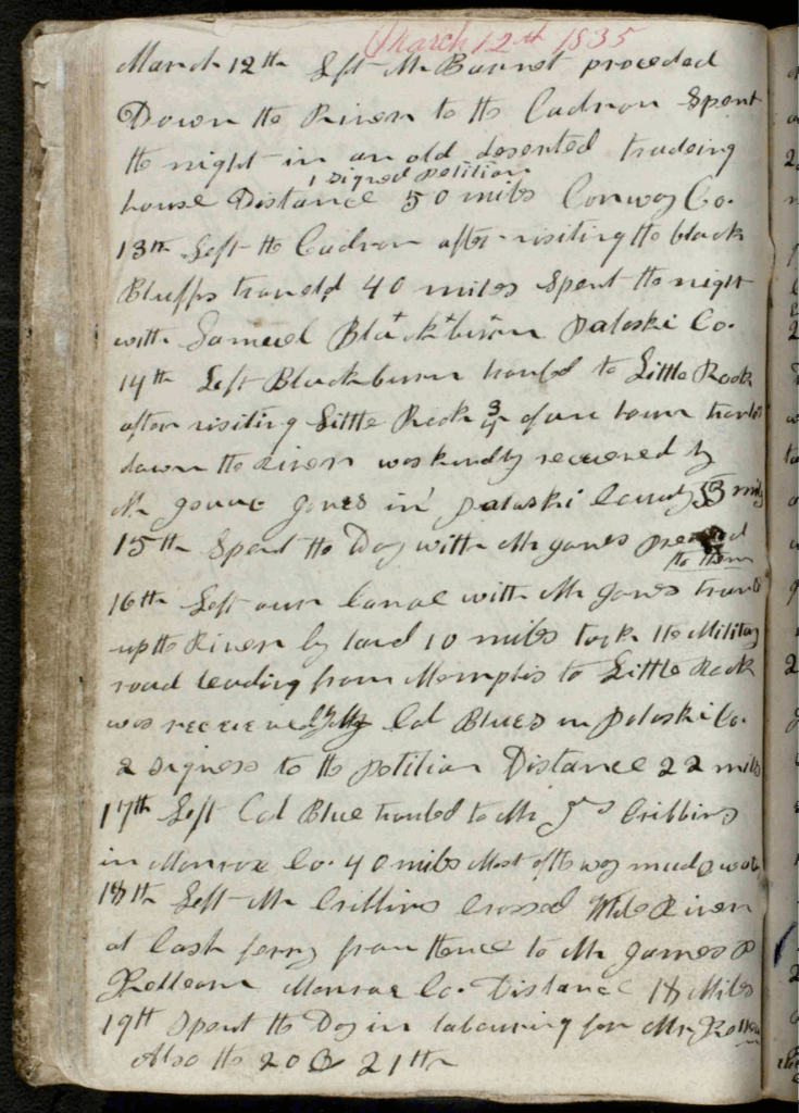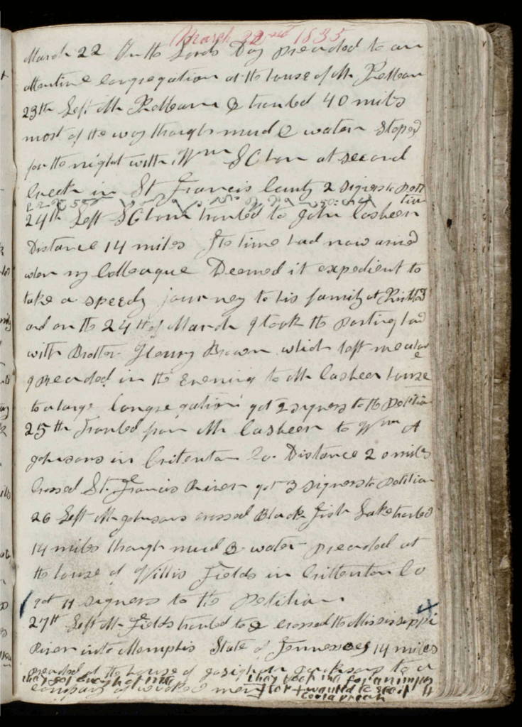 [Page 398]18 March 1835 (Wednesday): Left Mr Cribbins crossed Wite River at Cash ferry from thence to Mr James P Kelleam Monroe Co. Distance 18 Miles