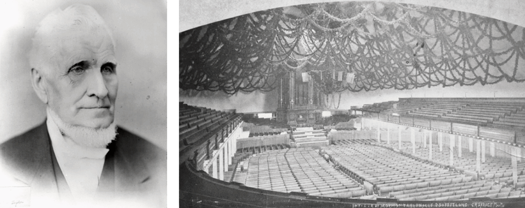 Figure 5. Left: President John Taylor shortly before his death, ca. 1887.38 Right: Interior of Salt Lake Tabernacle decorated with garlands, ca. 1890.39