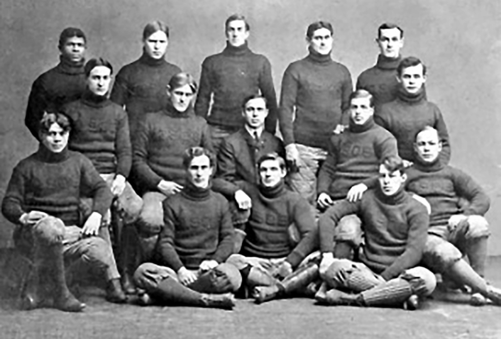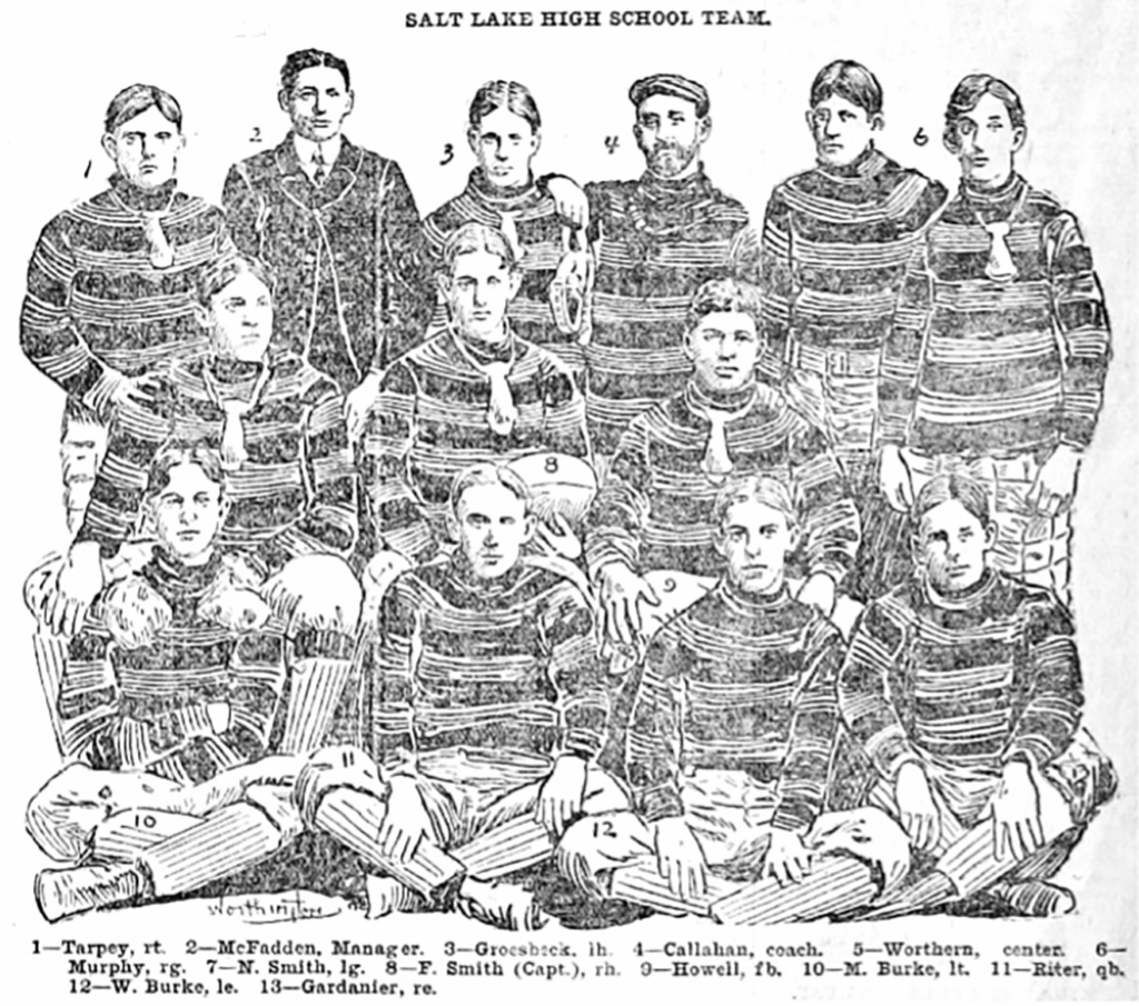 Football games seemed to receive more notice than any other local athletic event when the News was kicking off with its daily sports coverage. There were almost two entire columns describing the 34–0 victory of Salt Lake High over East Denver’s footballer’s [sic] on Thanksgiving Day in 1900. The game was attended by five thousand fans, including [Page 406]Utah’s Governor Heber M. Wells, arriving in a beautifully rubber-tired vehicle. Those were the days when perspiring huskies discarded gear as they played, fists flew frequently, and a colored fullback named Abe Howell “was everything from the band-wagon to the steam calliope” for Salt Lake High.