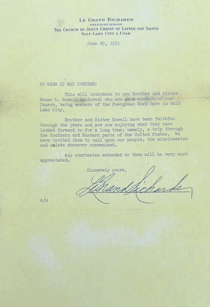 This will introduce you to Brother and Sister Abner L. Howell (colored), who are good members of our church, being members of the Evergreen Ward here in Salt Lake City.