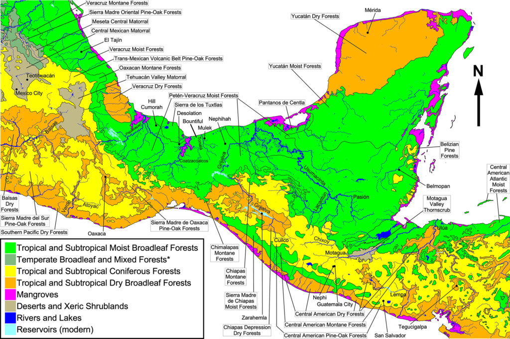 Figure 2 (opposite page). Mesoamerican Biomes. Six defined biomes (major havitat types) in Mesoamerica are represented by color (inset large box). Within each biome, black lines separate ecoregions, which are designated by individually boxed names. Rivers and lakes are shown in dark blue and reservoirs in light cyan (inset large box). Some rivers are labeled. Also labeled are seven modern cities (Mexico City, Oaxaca, Mérida, Guatemala City, Belmopan, Tegucigalpa, San Salvador), two archeological sites (Teotihuacán and El Tajín), and six proposed Book of Mormon locations (Zarahemla, Nephi, Nephihah, Mulek, Desolation, Bountiful, and Hill Cumorah). Bountiful is predicted to be near the coast and between the Coatzacoalcos and Tonalá Rivers or near one of these rivers. Teotihuacán and El Tajín are archaeological sites where ancient cement structures were discovered and date to Book of Mormon times. Mulek, Nephi, and Zarahemla correspond to archaeological sites known as La Venta, Kaminaljuyu, and Santa Rosa, respectively. *The Sierra Madre Oriental Pine-Oak Forests have also been classified as Tropical and Subtropical Coniferous Forest. Sources: Biomes and ecoregions: see appendix B. Rivers: Lehner and Grill, “Global River Hydrography and Network Rrouting,” 2171–86. Lakes and reservoirs: Messager et al., “Estimating the Volume and Age of Water Stored in Global Lakes,” 13603. Book of Mormon locations: Sorenson, Mormon’s Codex 22, 131–32, 142–43, 322, 538–39, 614–15, 632, 688, and maps 4, 8, 9, 10; John L. Sorenson, An Ancient American Setting for the Book of Mormon (Provo, UT: Foundation for Ancient Research and Mormon Studies; Salt Lake City: Deseret Book, 1985), 241; Ethan Lloyd, email correspondence with author, Spring 2025.