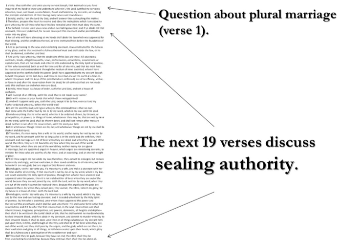 TPMR’s approach to the teachings of sealing authority found in verses 7‒20 seems to assume it was needed in order to establish plural marriage. But Joseph could have easily restored one without the other. He could have said, “Abraham had plural wives and I’m restoring that practice,” without mentioning eternity. He also could have said, “I’ve received authority to seal marriages,” without referring to polygamy as a commandment.