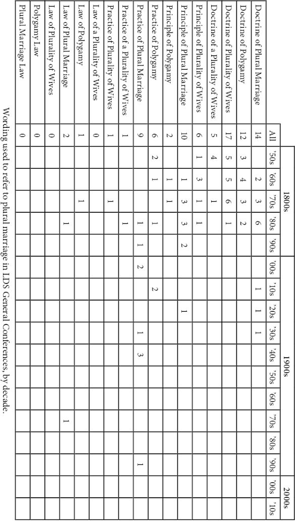 [Page 206]While LDS leaders and members in the past have used words like law, covenant, practice, principle, and commandment interchangeably, plural marriage was more commonly referred to as a doctrine, principle, or practice. A review of references to the practice in early general conference discourses shows that polygamy and plural marriage were seldom referred as a law.18 (See the summary in the table on the opposite page.)
