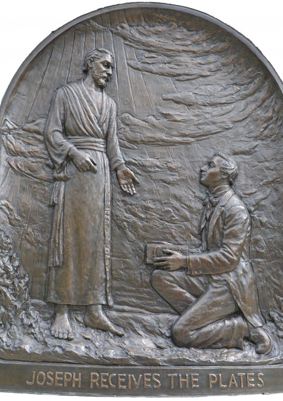 Image 1. Joseph receives the plates from Moroni. Relief on the west side of the monument atop the Palmyra hill. W. Aston photography.