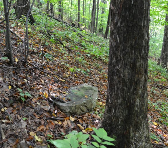 Image 2. A general view, facing south, of the west side of the Palmyra hill, near the summit. This is the general area where Moroni buried the plates. Large flat-faced rocks, like those shown in the foreground, are common on the hill. W. Aston photography.