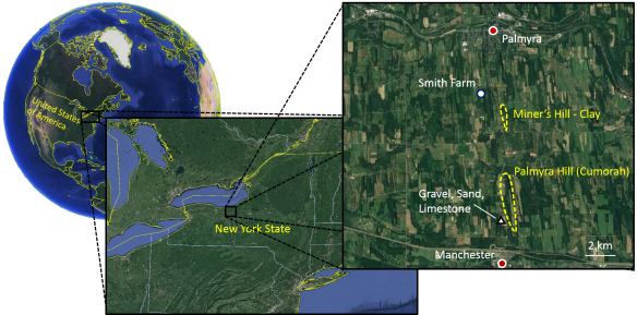The majority of the drumlin material consists of sand; it is the gravel deposits that commonly contain cobble- and pebble-sized pieces of limestone. Additionally, there are sizeable bedrock outcrops of limestone in the area, as evidenced by a working limestone quarry (the Dolomite Products Company) ~7 km (~5 miles) southeast of the Palmyra hill. Limestone and dolostone quarries are New York’s second most common type of mine.15