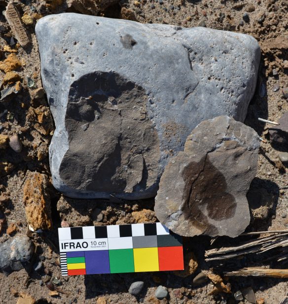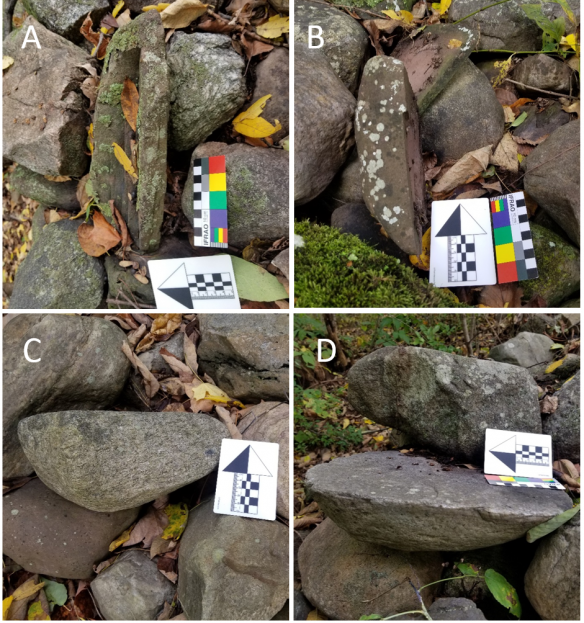 One question that arises is what Oliver meant by his use of the word “smooth” in order to determine which rock type is likely to have been used in the creation of the box. The sandstone cobbles consist of a fine grained, slightly-reddish tan color, quartz-rich sandstone with a rounded outer surface. They easily split along lamination surfaces to form fairly smooth, flat surfaces that could fit Oliver’s description of the box (see image 7B). Another common rock found was eroded or rounded pieces of light gray-pink colored granite and gneiss, many of which had at least one side that was flat and smooth. Although their surfaces are not as flat, they are smoother than the sandstone (see images 7C and 7D).