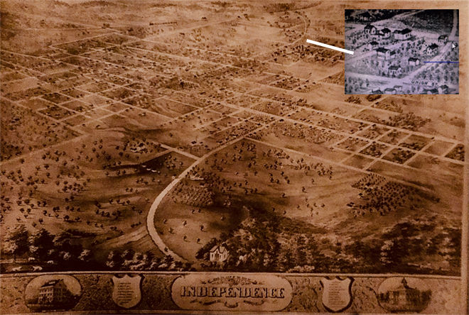 Figure 10. Bird’s Eye View of Independence with Temple Lot Property at Upper Right, 1868.