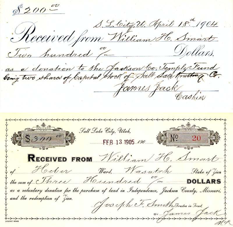 19. Photocopies of the receipts were generously provided to the author by Thomas and William Smart (Salt Lake City, Utah, and Kirtland, Washington, respectively), grandsons of William H. Smart to whom the receipts were written in 1904 and 1905. Photocopies provided in 2006. These receipts and other related documents have susequently been donated to the William H. Smart Collection, Special Collections, Marriott Library, University of Utah, Salt Lake City, Utah.