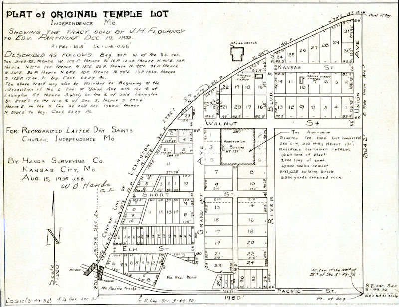 28. Photo of original 1935 document courtesy of Community of Christ Library-Archives. Used with permission. At the request of the Reorganized Church of Jesus Christ of Latter Day Saints the Hands Surveying Company of Kansas City, Missouri was hired to prepare a “Plat of the Original Temple Lot” sold by J. H. Flournoy to Edward Partridge on December 19, 1831.