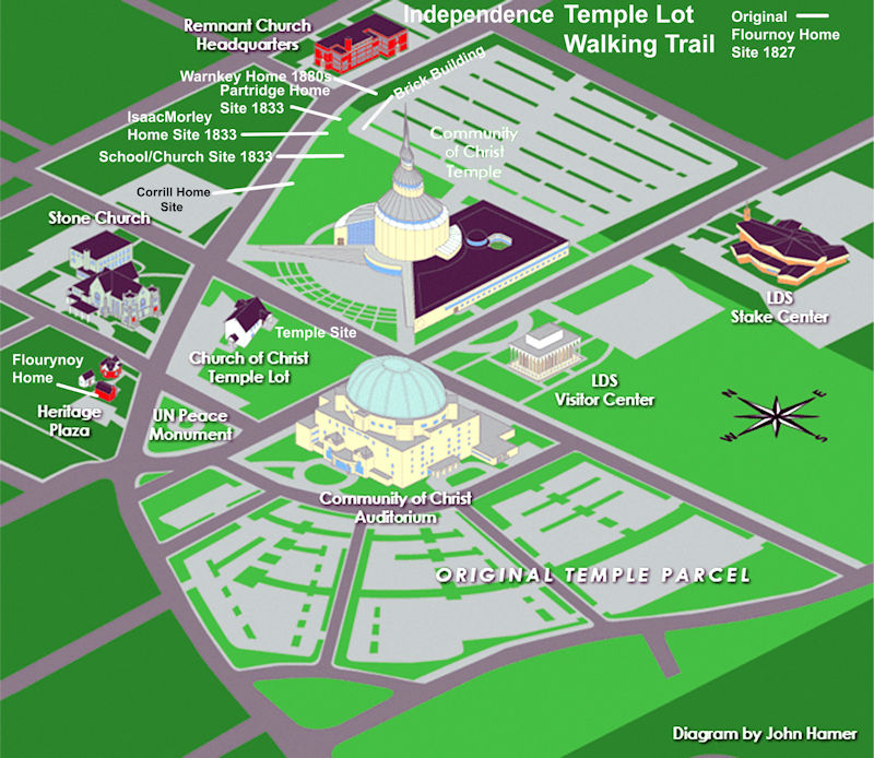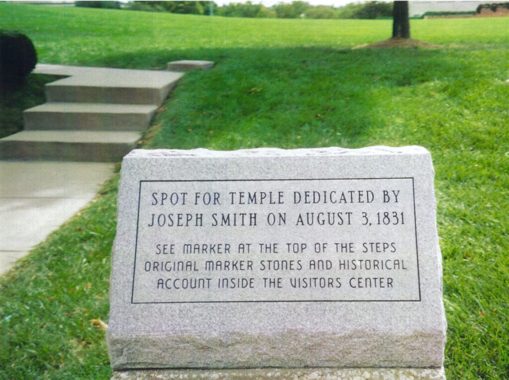 Wherefore, this is the land of promise, and the place for the city of Zion … the place which is now called Independence is the center place; and a spot for the temple is lying westward, upon a lot which is not far from the courthouse (Doctrine and Covenants 57:2–3, The Church of Jesus Christ of Latter-day Saints edition, hereafter LDS Doctrine and Covenants; cf. Doctrine and Covenants 57:1b–d, Reorganized Church of Jesus Christ of Latter Day Saints edition, hereafter RLDS Doctrine and Covenants).1