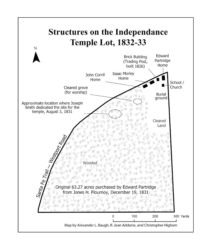 As planned, Jones H. Flournoy acquired his squatter’s claim on December 12, 1831.60 His deed shows that he bought a total of 160 acres for $320.61 One week later, on December 19, Partridge acquired from Flournoy, a 63.27-acre parcel of his 160 acres, which encompassed the dedicated temple site. Partridge paid Flournoy the sum of $130.00 or $2.055 per acre.62 Flournoy netted a profit of $3.48. The temple site and the surrounding property, thereafter, came to be known as the “Temple Lot” or the “Temple Property” by church members and locals alike.63