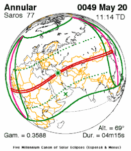 Figure 1. Path of the annular eclipse on 20 May AD 49. Image from NASA, eclipse.gsfc.nasa.gov/5MCSEmap/0001-0100/49-05-20.gif.