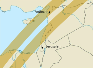 On 20 May AD 49, an annular eclipse of the sun occurred. This eclipse has been documented by the National Aeronautics and Space Administration (NASA), who show that the path of the eclipse ran across Africa through the ancient Levant and on to Asia as can be seen in figure 1.5 Figure 2 shows a close-up of this path, which ran just north of Jerusalem and right over Antioch. The eclipse allowed observers to see the edge of the sun around the moon, which is known as a “ring of fire” eclipse (figure 3).6 It was not a total eclipse because the moon was unable to block the sun completely—the moon was simply too far from the earth. This made it particularly dangerous to look at without some form of eye protection.7 Observers would have watched as [Page 160]darkness descended and would have been aware of a sharp drop in temperature. For those in the center of the eclipse path, the event would have lasted over four minutes. As it ended, they would again feel the heat of the day as the moon no longer blocked the sun.