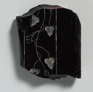 Obsidian, a natural volcanic glass, was used by the Romans for sculpture, vessels, and—as here—decorative panels. The ivy and vine tendrils originally may have been filled with inlays in contrasting colors, as in the case of the obsidian [Page 165]cup with Egyptianizing ritual scenes found at Stabiae and now in the Archaeological Museum, Naples.14