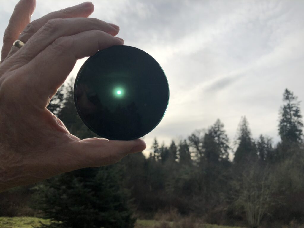 Figure 6. The sun just above a tree line seen through an obsidian disk on a hazy day. The green tint is indicative of magnetite in the obsidian. Photo by the author.